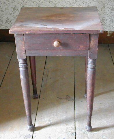 Square topped side table with turned legs. It has one drawer with a center knob.