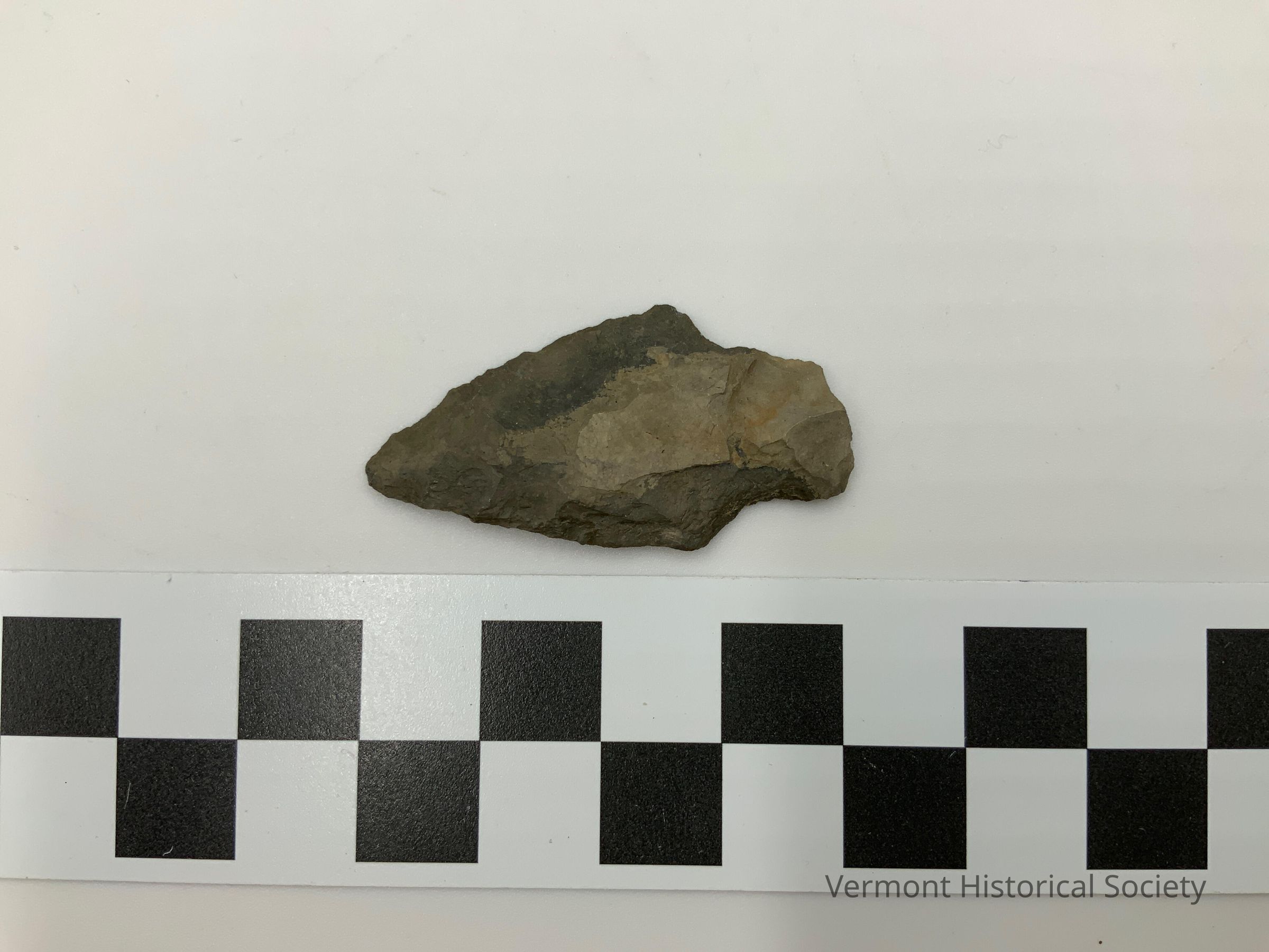 Chipped stone projectile point with a straight stem.