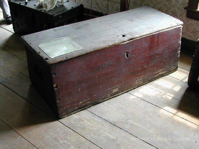 According to family history, this chest was taken from a Pirate vessel on the High Seas by John Paul Jones during the American Revolutionary War. After its contents (women's clothing) was distributed among Jones' crew, he gave the chest to William Hodgkins. After Jones stranded Hodgkins in France, he worked his way back home to America. He finally settled in Grand Isle, Vermont.