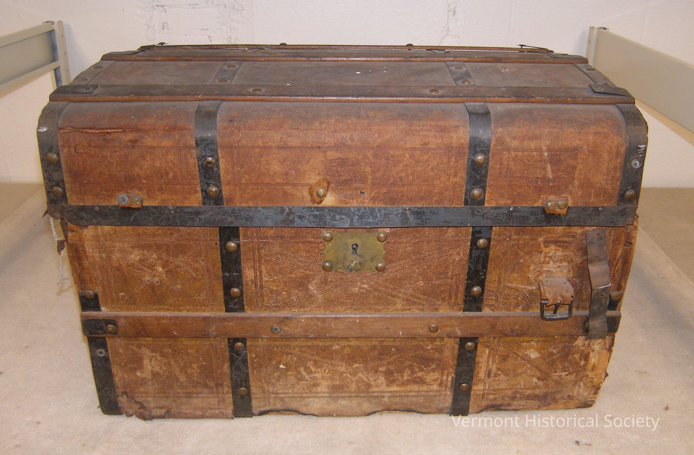 Trunk. Monogram on side of trunk J.Y.D. Label with no. 2 written on it. Geometric designs inlaid or scratched into front. Inside lined with white paper with blue polka dots, and blue snaffle bits. Label on inside reads: "Storage box Mu 96; Trunk which belonged to Dr. Julius Y. Dewey; to be sent to Kent Tavern.