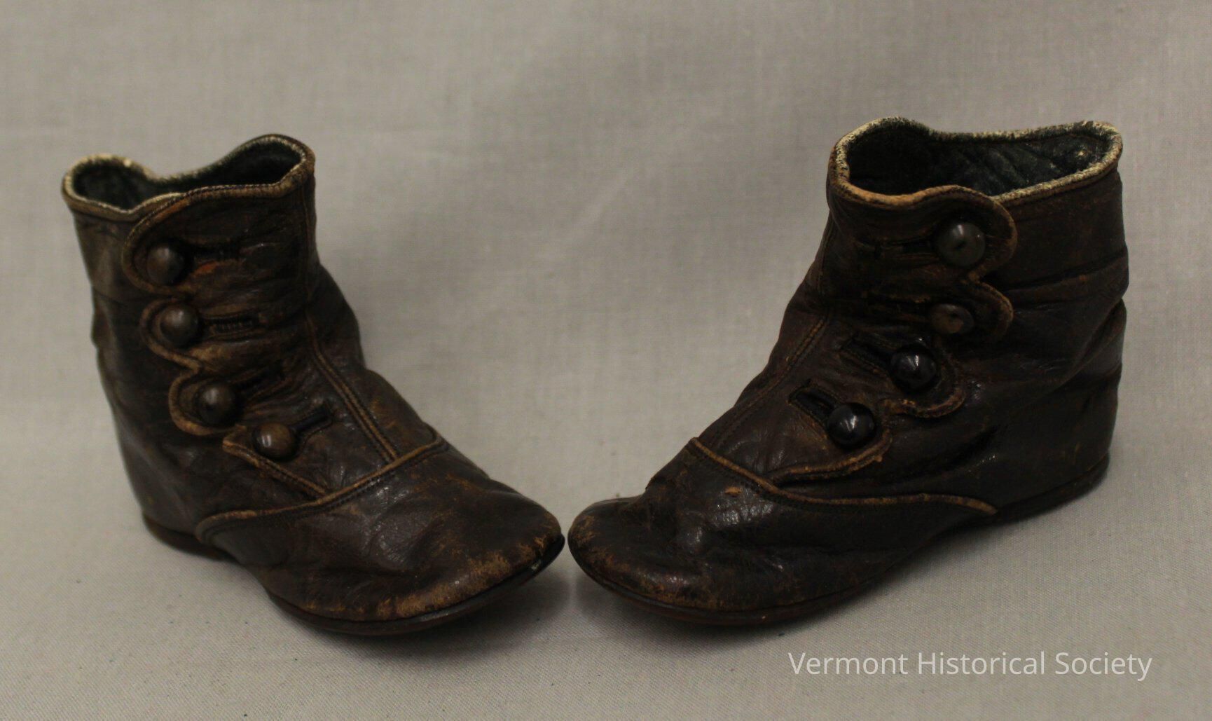 Small brown leather boots sized for a young child. They have soft, brown leather soles. They secure around the ankle with 4 black buttons, placed slightly toward the outside of the foot.