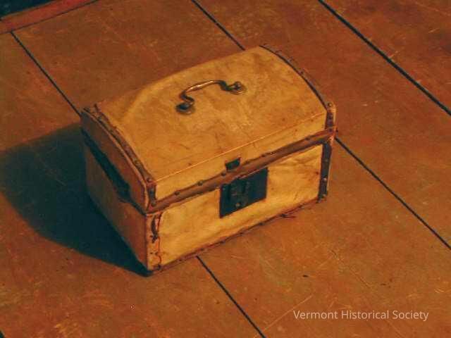 Small traveling trunk covered with paper. It has a slightly domed top with a drawer pull handle at the center. There is a lock at the center front.