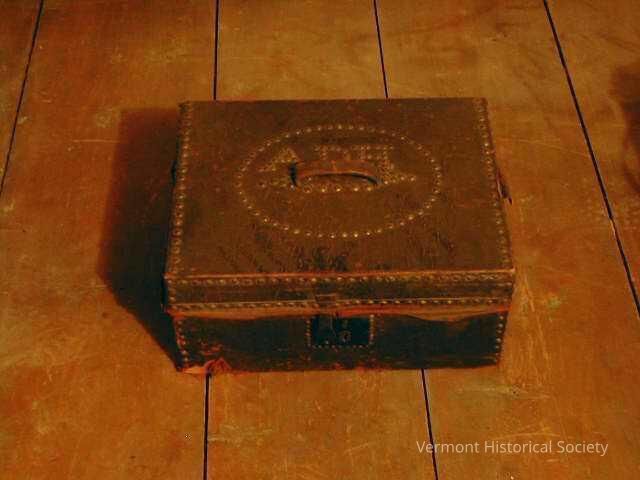 Traveling box or trunk. The box is covered in leather, decoratively held in place with brass tacks. The center top has a short leather handle, around which are tacks arranged in an oval, and the initials "A. D. H." The center front has a rectangular iron escutcheon covering a locking mechanism.Context