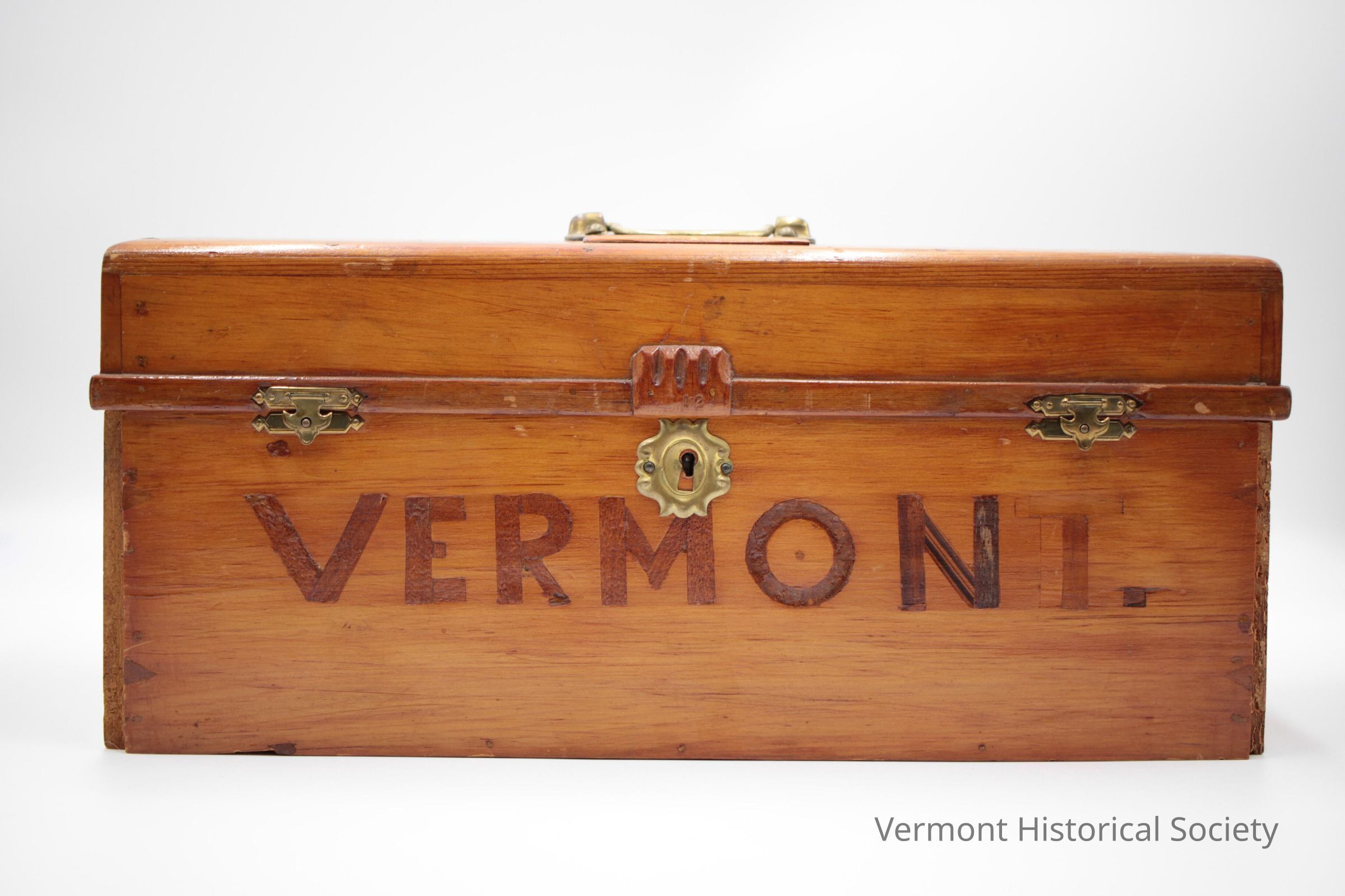 Purposefully constructed historic relic consisting of a chest, gavel and sounding block. The chest is made of wood with a brass handle at the center top, two brass hinges, two brass latches, and a brass escutcheon. The center front is inlaid with the word, "VERMONT." The interior of the box is lined with white satin and inside rest a wooden gavel, held by the handle in a velvet stand. The gavel has small square and diamond-shaped inlays throughout its surface. The interior of the lid is hollow and fronted with glass. Inside are several small objects, included a toy cannon, several pieces of wood, a miniature gavel, and paper currency. The top of the chest has a small window separated into two compartments: one holds dirt and the other holds sticks.Context