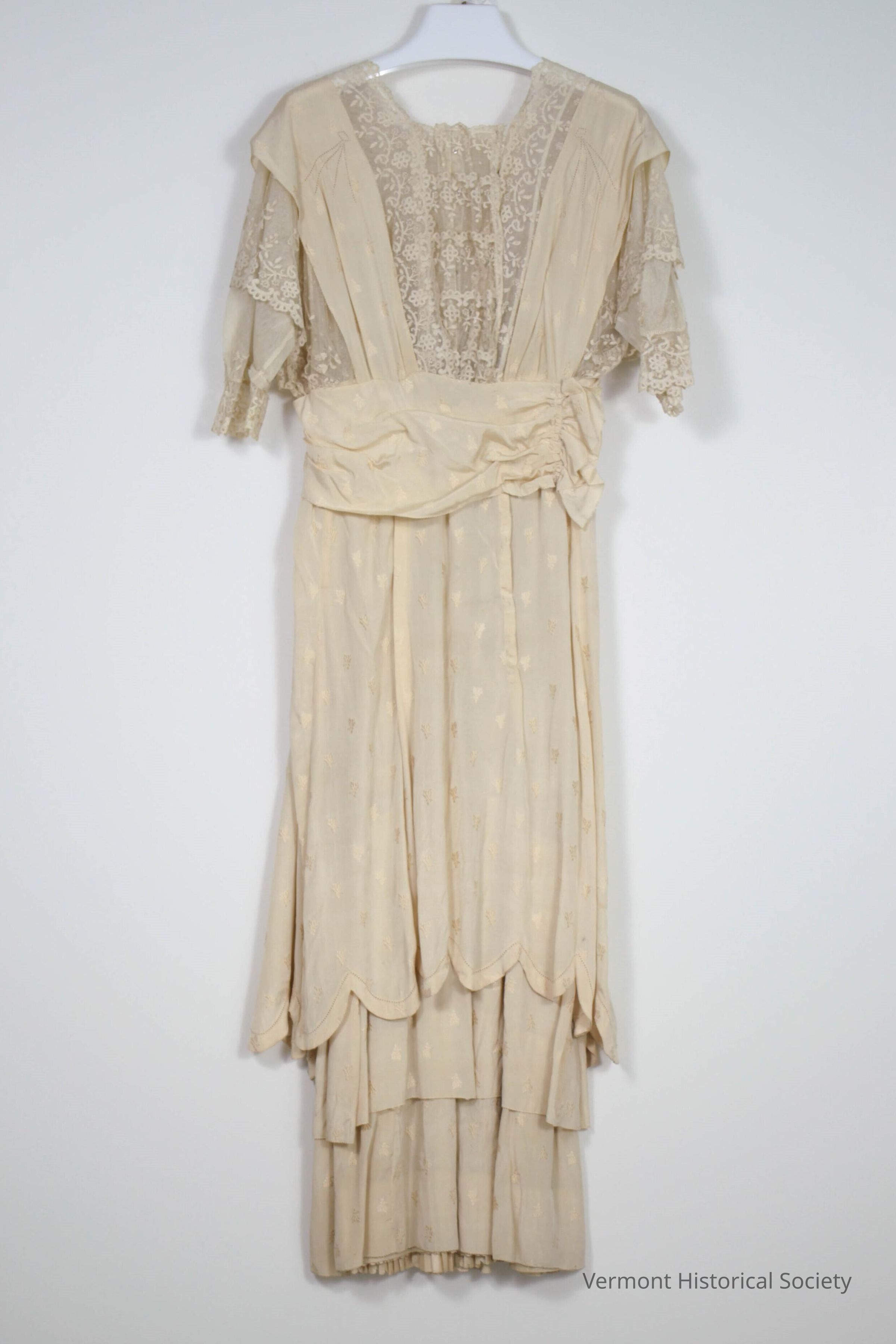 Owned by Alice Emery Ladd Goss (1876-1964) of Middlesex, Vermont. Said to have been Alice's wedding dress, but she was married 21 Sep, 1898, so unless it was remade in the 1910s, the attribution is incorrect. She married Osmund L. Goss (1871-1957) , a salesman for Grand Union Tea Co. They lived in Montpelier and had no children.Acquisition