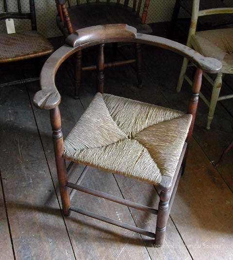 Corner chair with a rush seat. The chair has a U-shaped rail forming the back and arms.