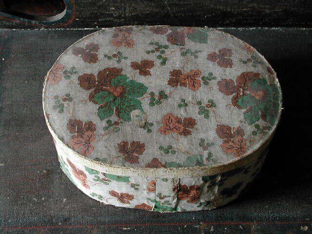 Oval bandbox covered in printed wallpaper. The wallpaper is printed with a maple leaf pattern in green, red, and orange.