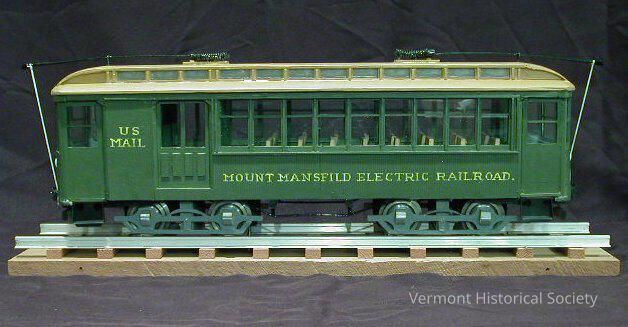 This model is of the Waterbury-Stowe Interurban rail car used on the Mount Mansfield Electric Railroad between 1898 and 1933.