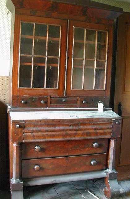 Tall, Grecian revival desk with a glass-fronted upper bookcase. The feet are scrolled, and there are pillars flanking the 2 lower drawers.