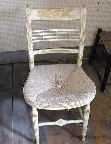 White-painted side chair with rush seat. The back of the chair is decoratively painted on the rail with flowers and feathers.