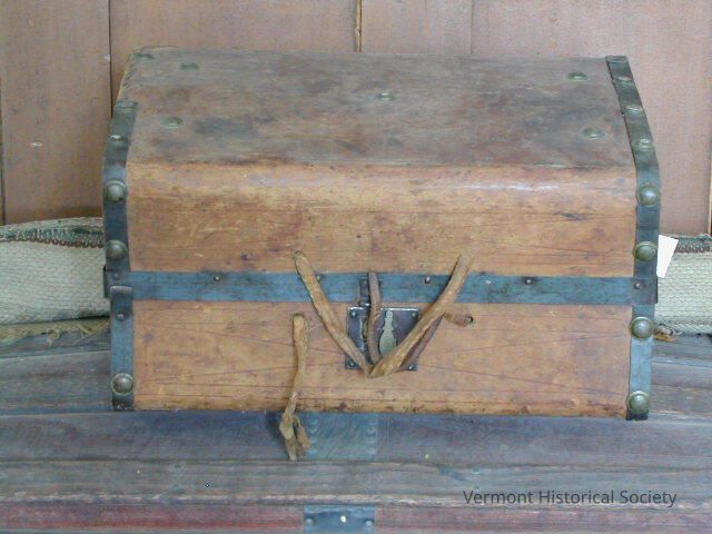 Small leather-covered trunk. The sides are straight and the top is convex. There are two short leather handles at the top. The edges are decorated with large brass tacks over strips of metal. There is a metal lock at the center top.Context