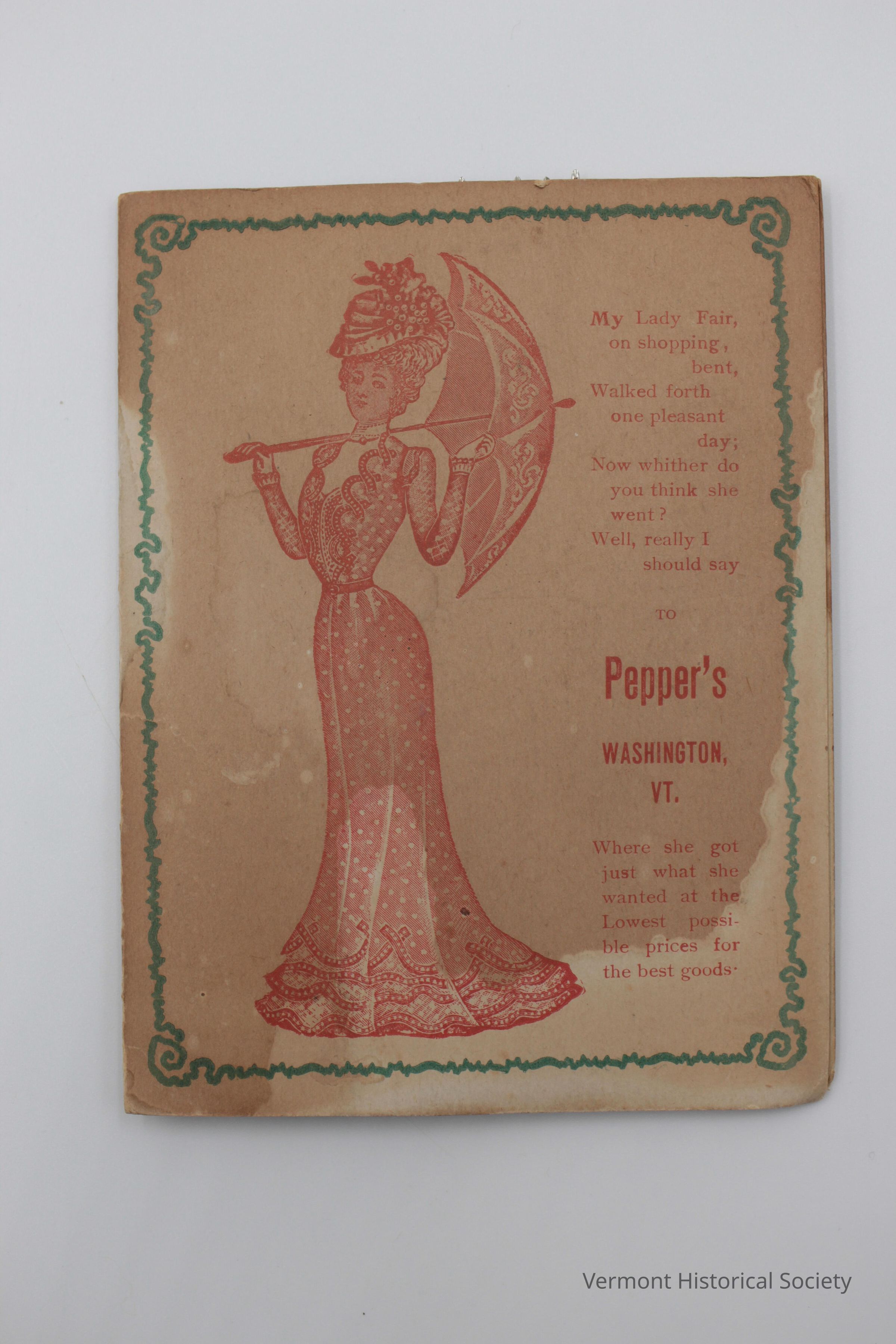 Small paper folder, printed in green and red ink containing various types of needles (35 total). The front cover of the needle packet has an image of a well-dressed Victorian lady carrying a parasol and it reads "My Lady Fair, on shopping, bent, Walked forth one pleasant day; Now whither do you think she went? Well, really I should say TO Pepper's WASHINGTON, VT. Where she got just what she wanted at the Lowest possible prices for the best goods." The inside front cover has a small fabric swatch at the top which holds 10 needles. Below that, a smaller paper insert holds the rest of the needles and is printed with an image of Martha Washington and reads "ELLIPTIC GOLD EY'D." On the inside front cover the contents of the needle packet are listed between two printed calendars for the years 1904 and 1905. The inside back cover has an additional advertisement for A.H. pepper that reads "The Woodman Makes the Chips Fly But We Make the Bargains Fly, You'd Better Catch Some of the Bargains "On the Fly." We always keep the best of Groceries, Boots, Shoes and/Rubbers, Cigars, Tobacco, Fruit and Confectionery, Flour A Specialty. A.H. PEPPER, Washington, VT." The back cover has an additional printed advertisement specifically for shoes sold at A.H. Pepper.Context