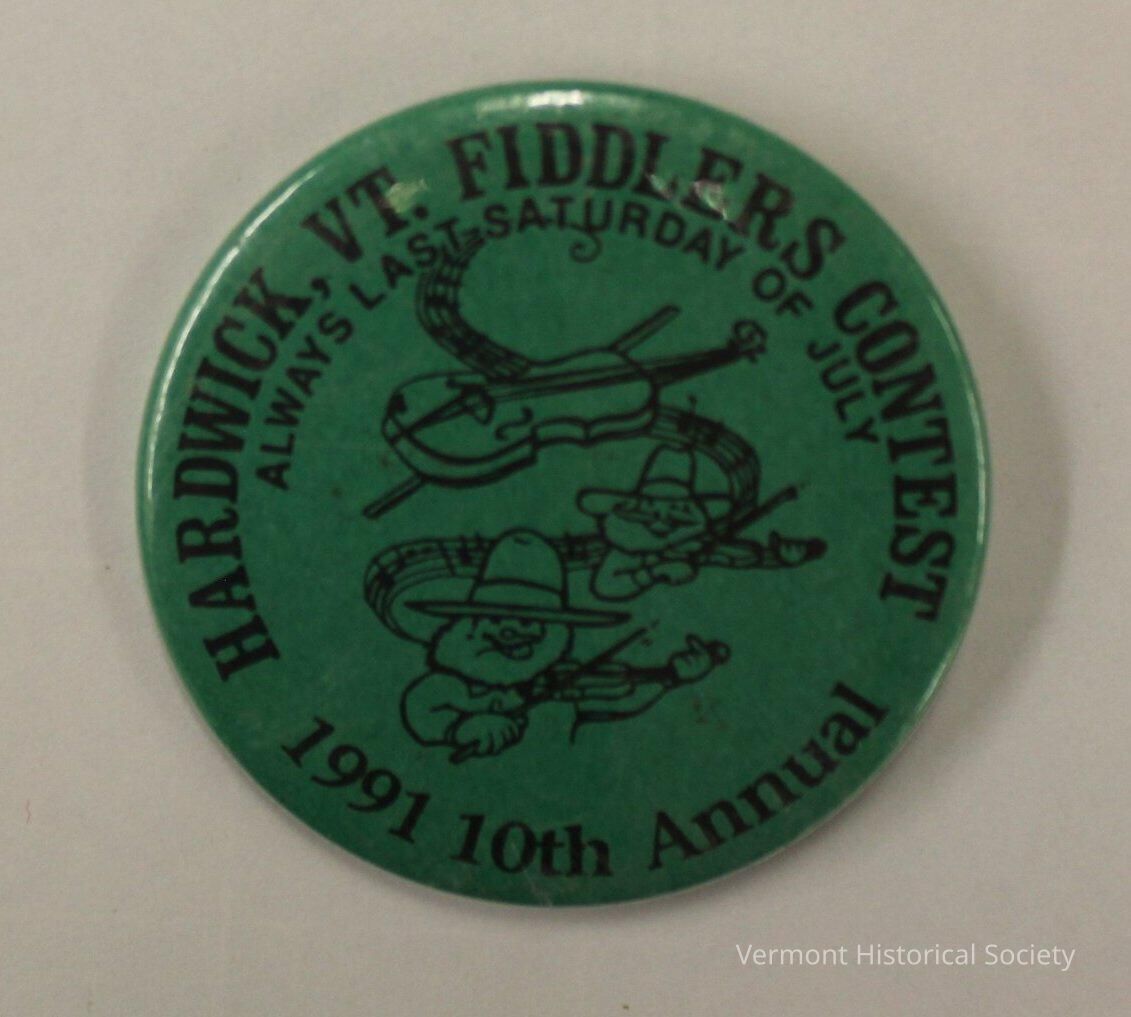 Green pin with black lettering and graphics. In the center of the pin are two men playing the fiddle with a music staff swirling through them. Written around the outside edge of the pin is "HARDWICK, VT. FIDDLERS CONTEST / ALWAYS LAST SATURDAY OF JULY / 1991 10th Annual".Context