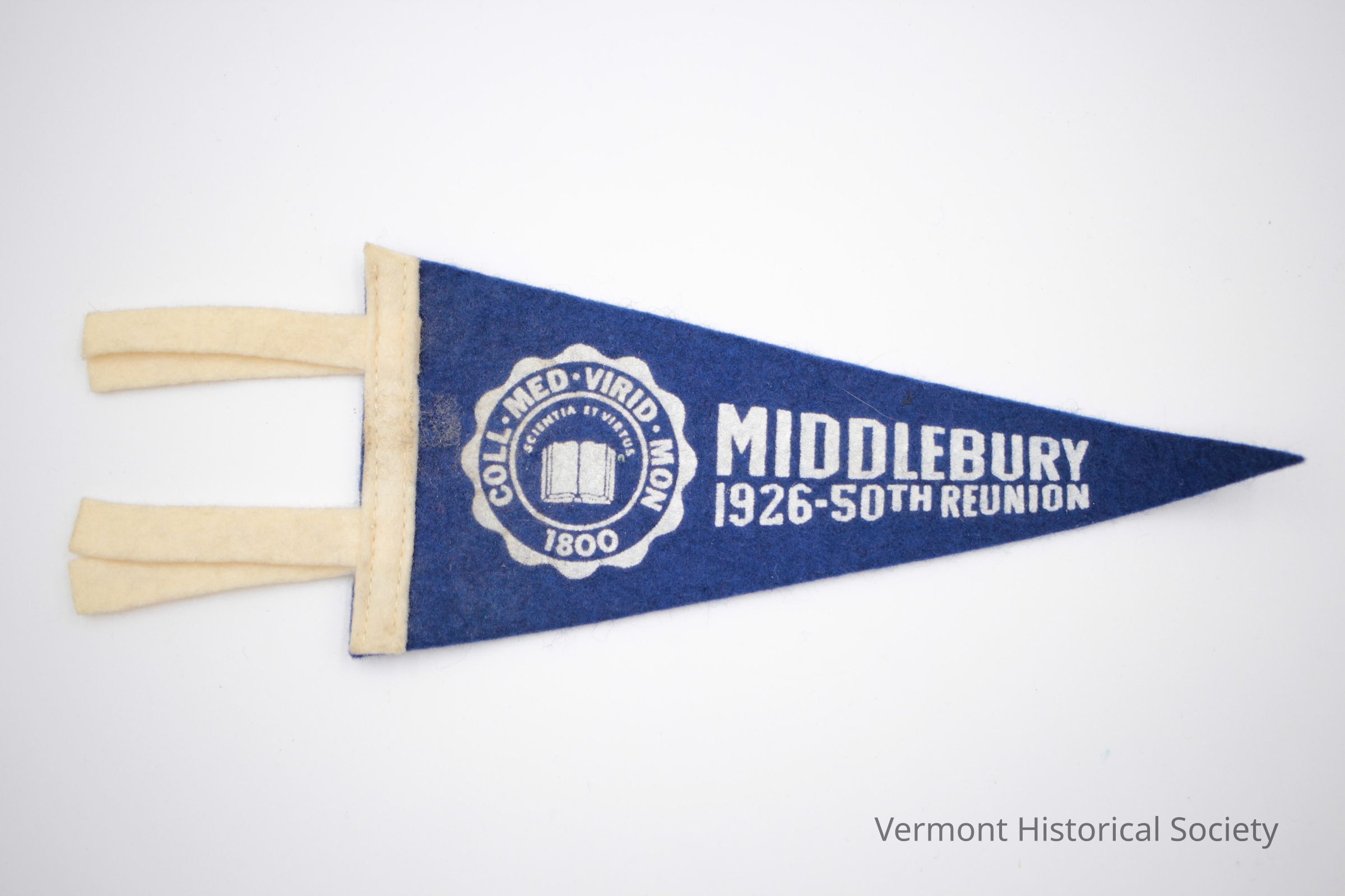 Small blue pennant with the white Middlebury College seal that says "Coll.Med.Virid.Mon 1800" around the outside and "Scientia et Virtue" in the center with a book. Also in large white letters, "Middlebury 1926 - 50th Reunion."