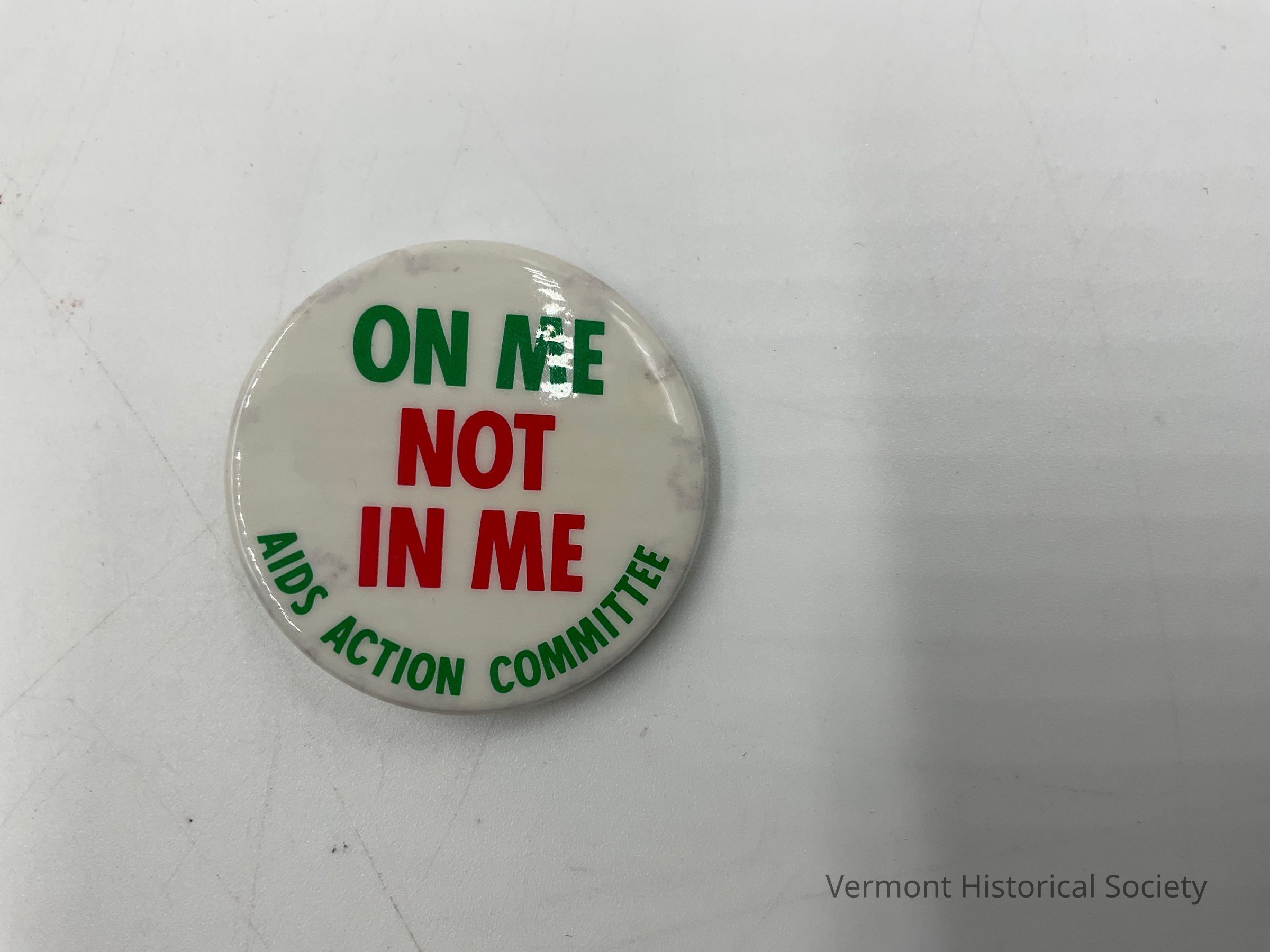 The slogan "On me not in me" was a slogan that became popular in the gay community in the Northeast after the AIDS epidemic broke out in the 1980's. It related to safe sex practices. It is unclear who the AIDS Action Committee was or whether it was a Vermont organization.