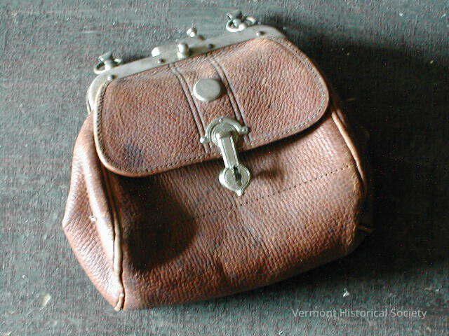 Small, brown leather pocketbook or purse. It secures with an envelope-style flap that locks with a metal latch at the center front. There is a metal bar along the top where a chain can attach for wearing.