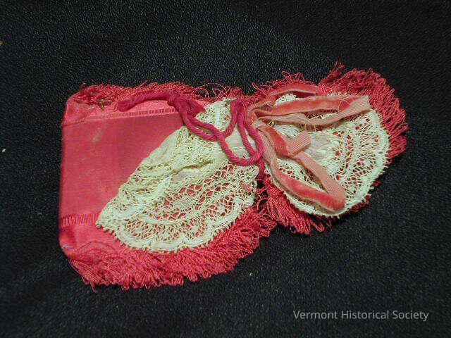 Small sachet made from red silk ribbon. The edges are trimmed with fringe, and the front is decorated with an oval of bobbin lace. It secures closed with a red drawstring.