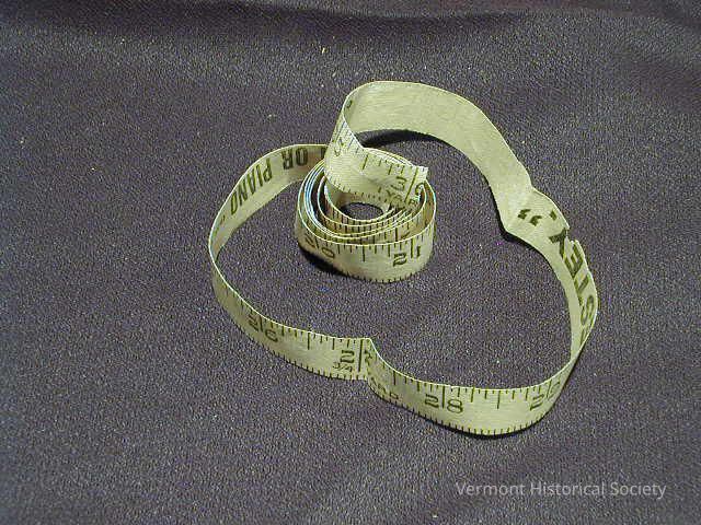 Cloth tape measure. One side is printed with hash lines indicating inches and 1/16 intervals of inches. The other side is printed with an advertisement for Estey Organ Company.