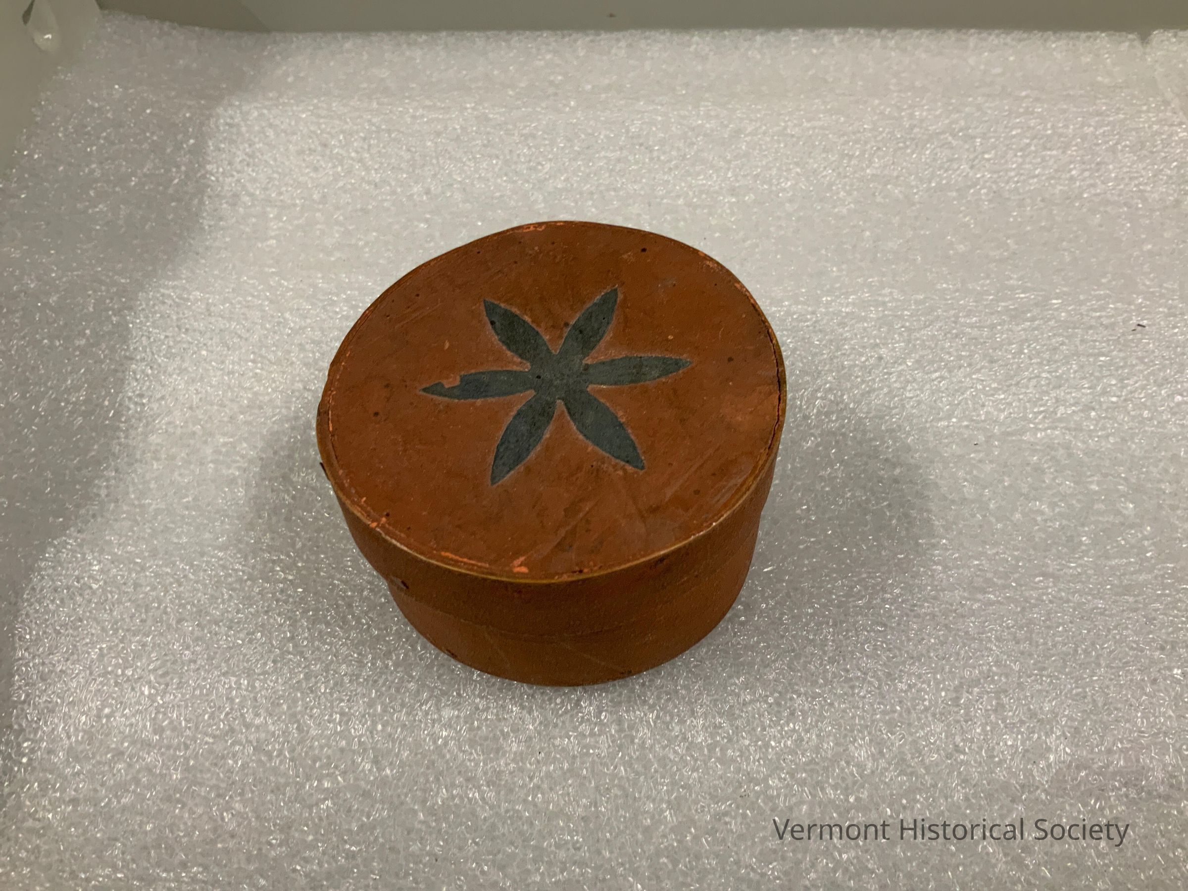 Small wooden bandbox. The box and detachable lid are painted red with a blue 6-pointed flower or star at the center top.