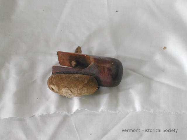 Pincushion on a wooden clamp. The clamp consists of a cylindrical piece of wood, hollowed out on one side with a wooden screw inserted through the bottom, extending into the hollow. On the top is a thickly stuffed oval of velvet, edged in black wool tape.