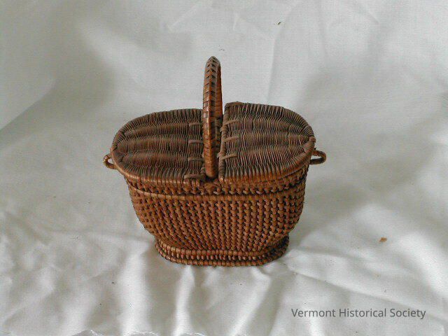 Small basket, sized either as a toy or for trinkets. The basket is shaped like a picnic basket: it has an oval base, a U-shaped handle spanning the width of the center top, and two hinged lids, attached at the center. It is woven in a plain-weave with wicker singles.Context