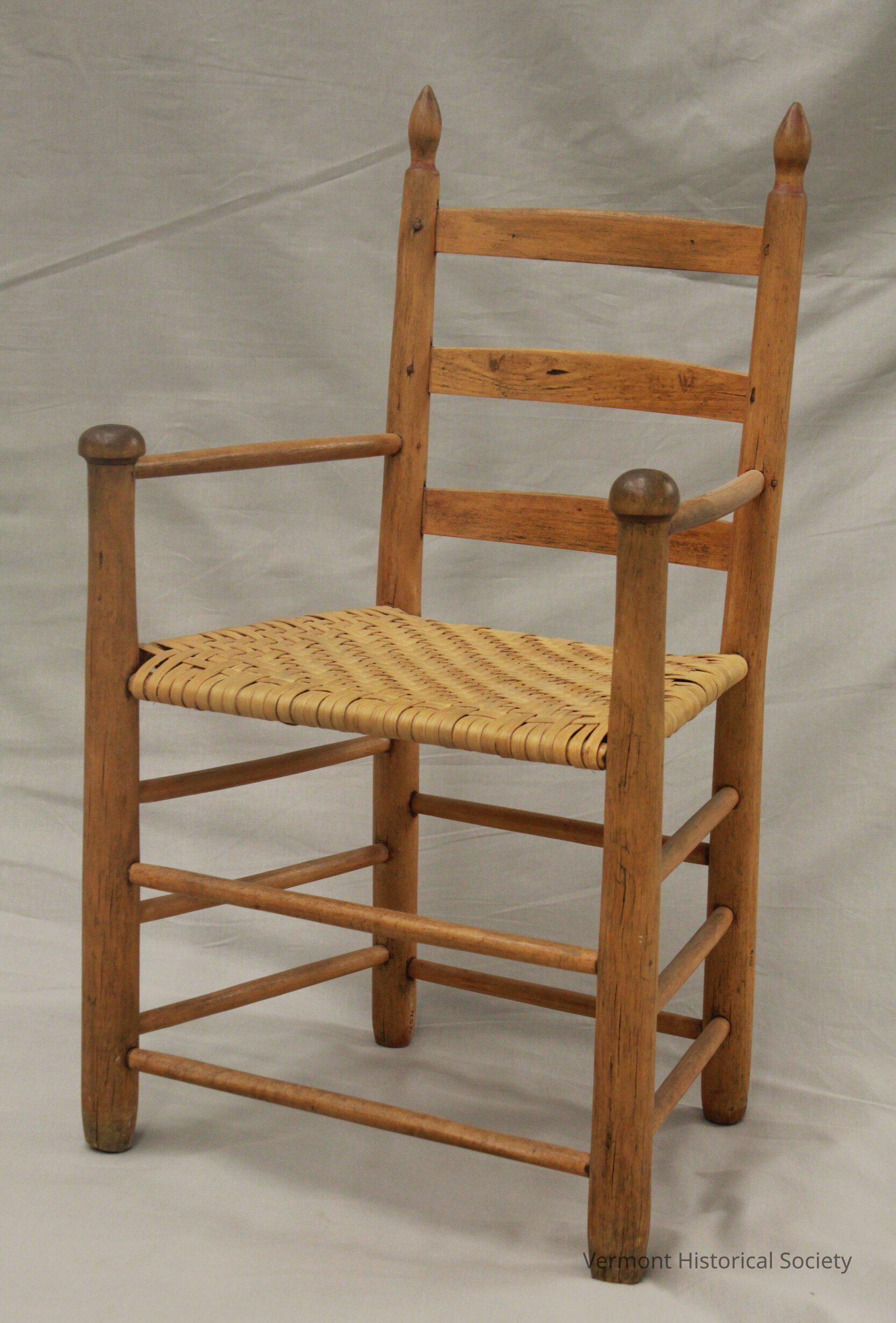 Benjamin W. Powers was the progenitor of three generations of chairmakers who worked in East Lyndon for almost a century. According to tradition, Powers began to work in the town soon after his marriage in 1814. He developed a specific style of slat-back chair with a woven ash seat, which in the mushroom turnings of the arms and placement and number of rungs resembles chairs made in the Plymouth Colony during the seventeenth century. Whether this similarity was intentional (1820 was the bicentennial of the landing in Plymouth) or simply coincidental is unknown. In either instance, the basic shape was only slightly modified over the years by his son Benjamin F. Powers (1816-1897) and his grandson Henry G. Powers (1840-1901). The two later generations usually stenciled their names on the back of the middle slat of their chairs.
