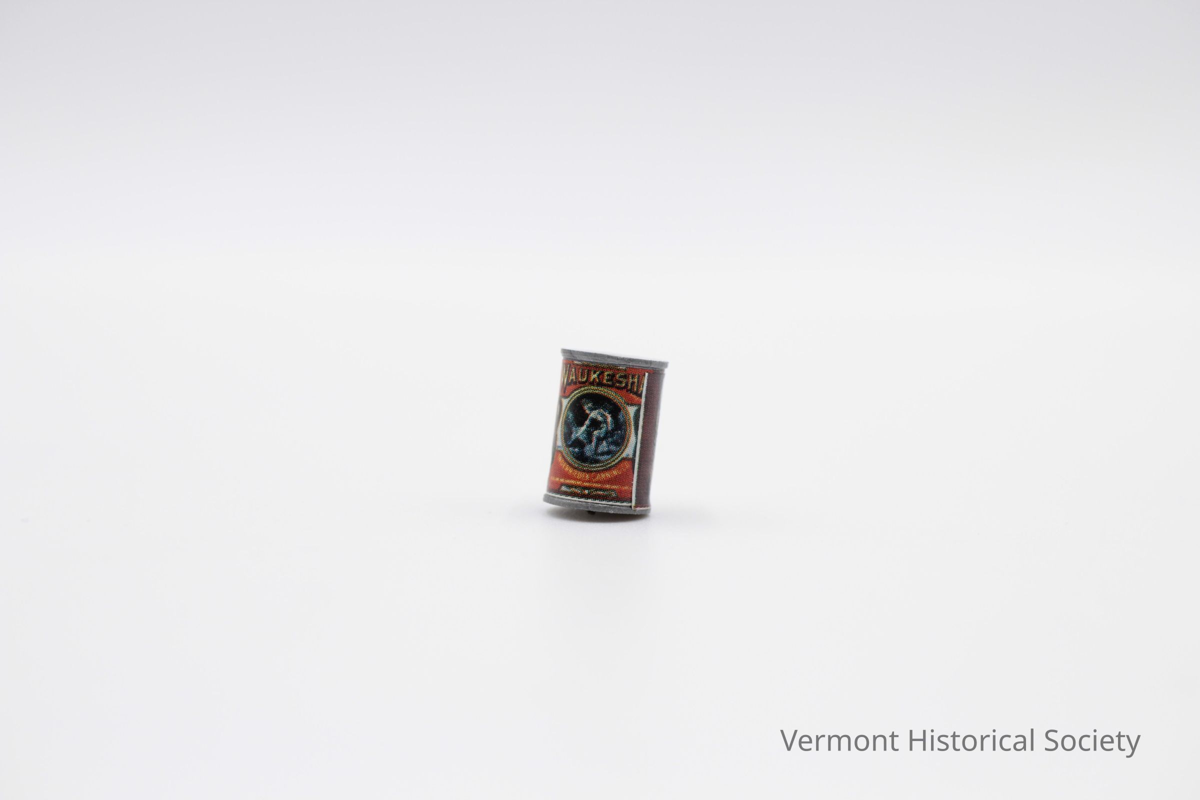 Miniature cylindrical food-storage can. The can is made of silver-colored plastic and is wrapped with a printed paper label. One side of the paper label shows a round medallion with the word, "WAUKESHA". The other side shows a tureen of soup with the words, "WAUKESHA BRAND GREEN PEAS".Context