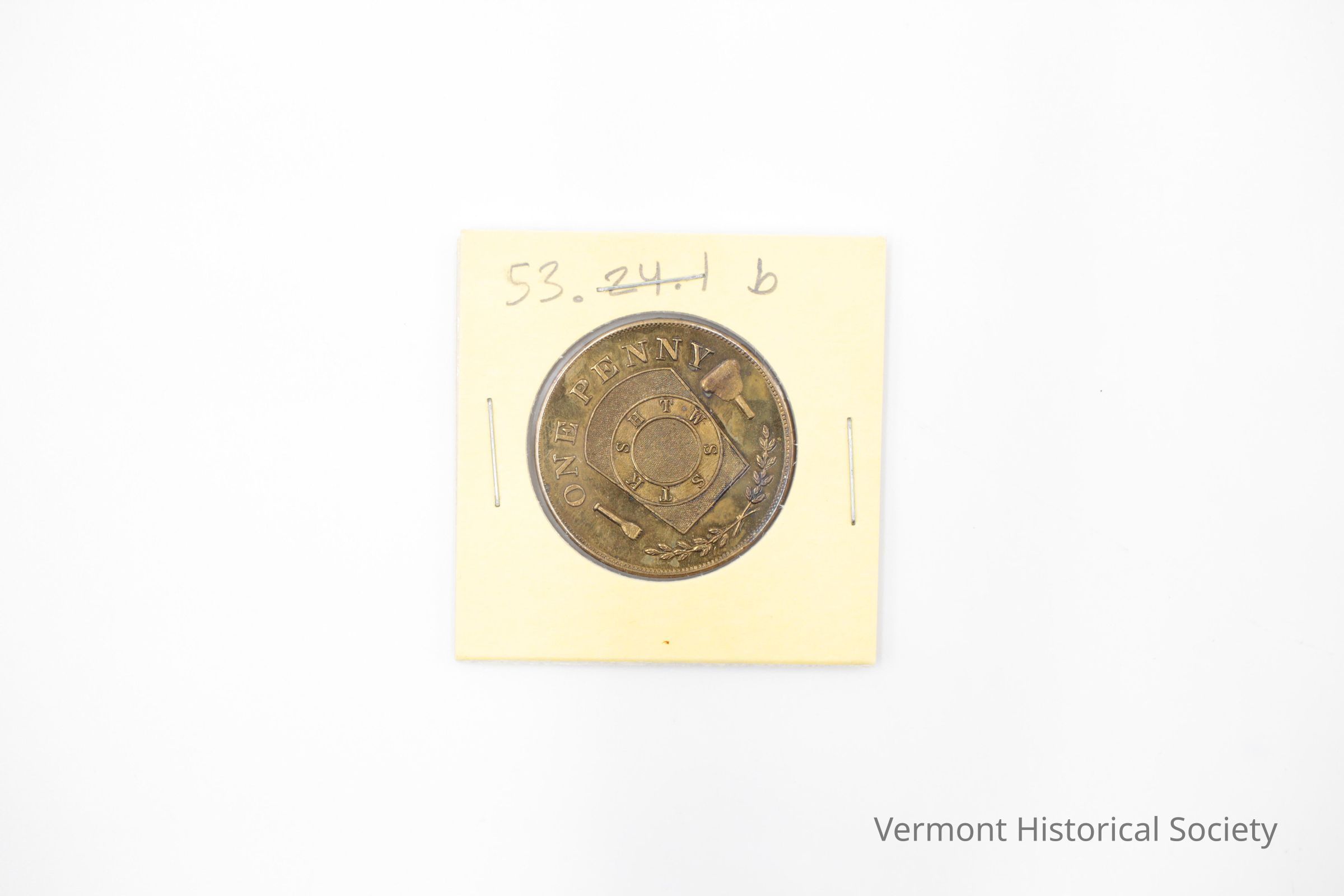 Gold-toned metal token with the words "ONE PENNY" on the obverse with an olive branch at the bottom, a tablet with a circle of initials "H T W S S T K S" in the center, a chisel, and a funnel. On the other side of the token are the words, "Cleveland Chapter No. 20 R.A.M. Newport, Vt.”Use