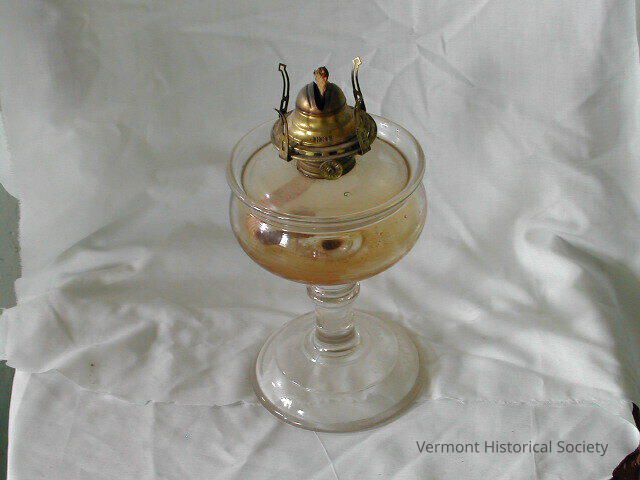 Glass oil lamp. The lamp sits on a round pedestal with a round base. The reservoir is round with a flared opening and inset cover. There is a brass wick holder at the center top with a flat, woven wick. One end of the wick is sticking out of the top of the holder and the other, longer end is coiled within the reservoir. There are four brass arms pointing upward from the wick holder in order to hold a chimney (not present).