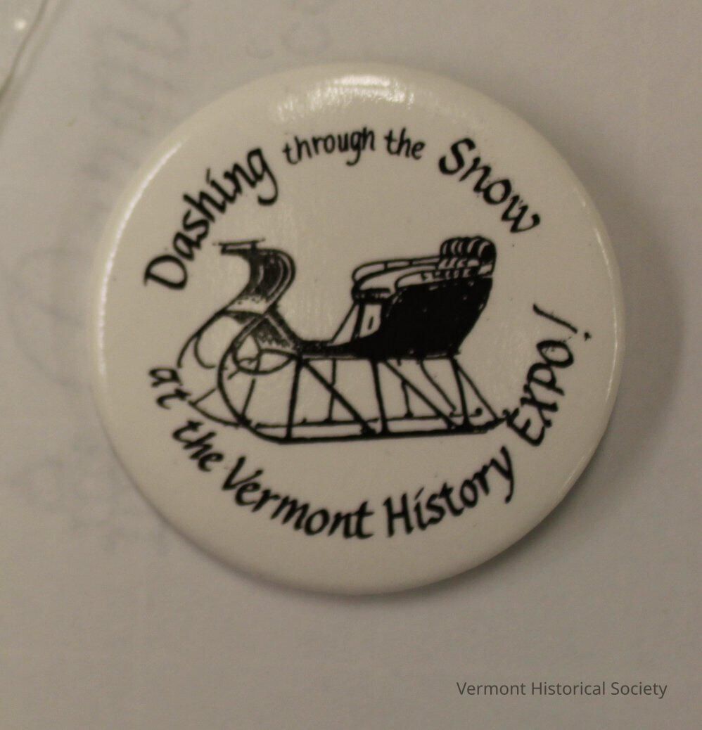 Round white button with the black inscription, "Dashing through the Snow at the Vermont History EXPO!" around an illustration of a sleigh.Context