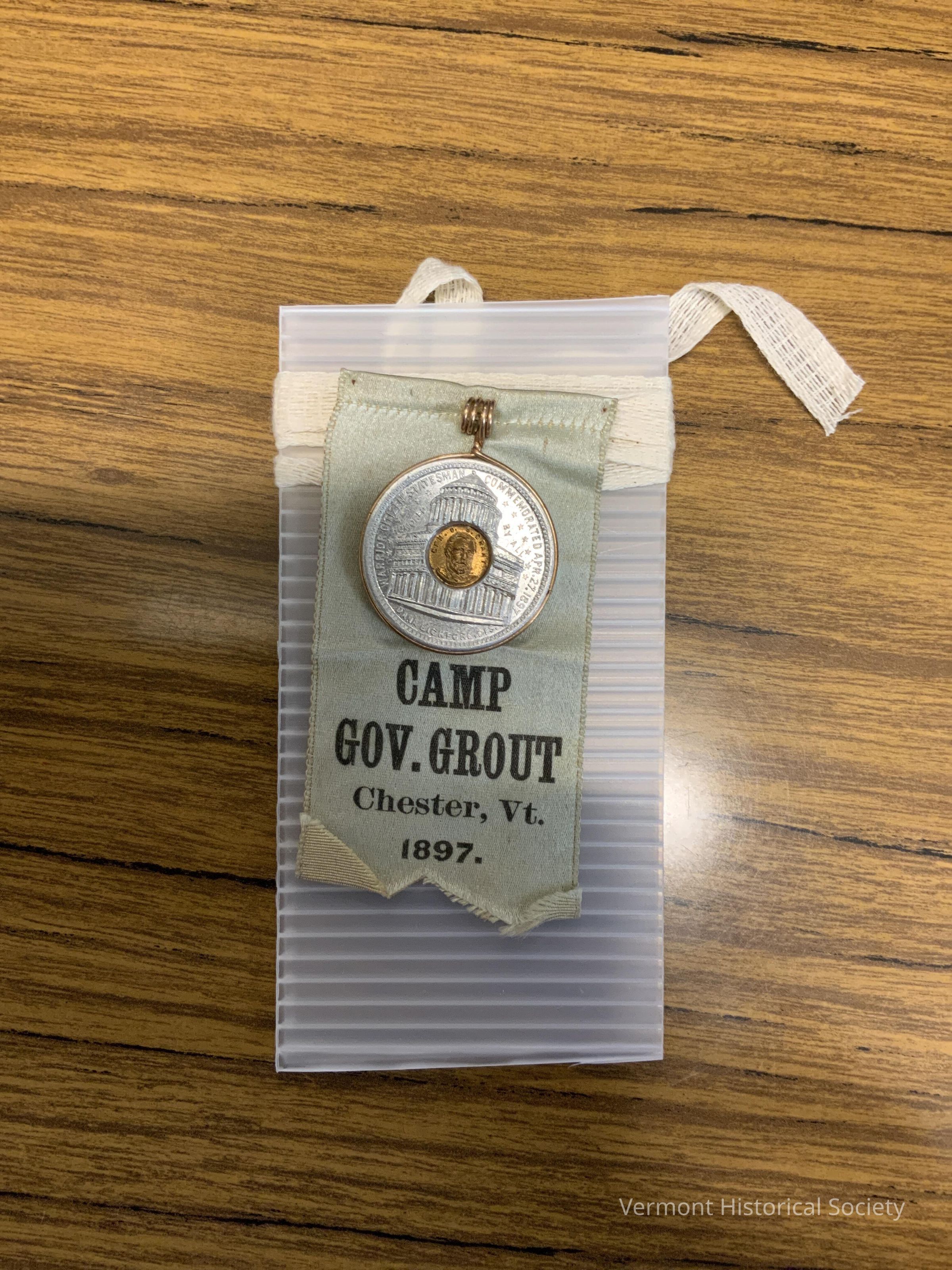 Membership ribbon with an attached Bickford coin. The light green satin-woven ribbon is printed in black with the inscription, "CAMP GOV. GROUT Chester, Vt. 1897." The coin aluminum with a bronze center, and is held within a gold-toned metal wire, which is coiled at the top and stitched to the ribbon. The center of the coin is molded with a bust of Ulysses S. Grant, and the aluminum portion of the coin is molded with an image of Grant's tomb and the inscription, "WARRIOR CITIZEN STATESMAN COMMEMORATED APR 27 1897 / DANA BICKFORD, DES." The other side of the coin bears the inscription, "Here is shown the value of our dollar in the coin of different nations of the world." Below that are eight connected circles, each giving the coin value of a different country, and below that: "Invented & protected by Dana Bickford.Context