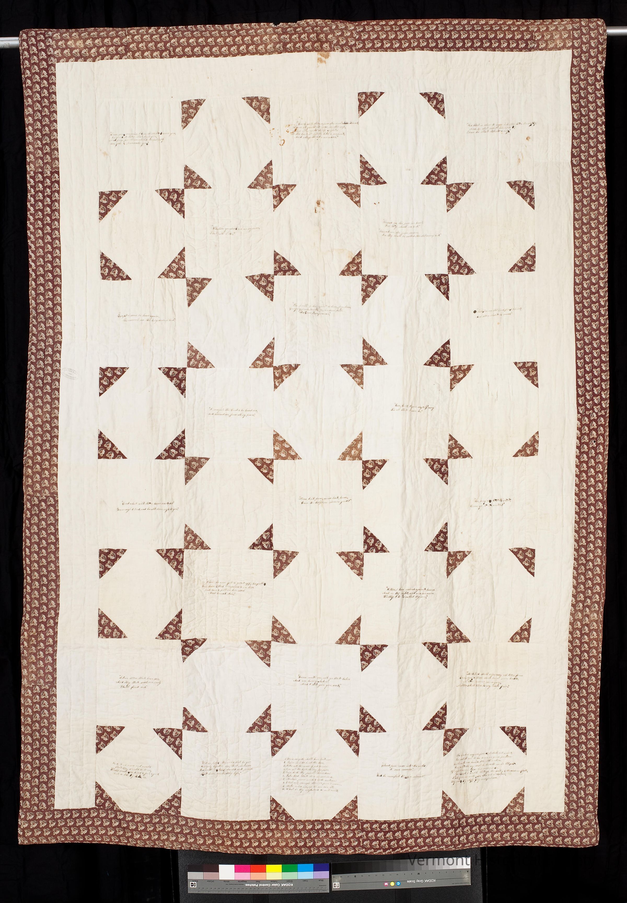 Pieced quilt made of plain white and red floral-printed calico cotton. The blocks alternate between a plain white block, and white blocks with triangular corners in the printed fabric. The plain blocks are quilting in straight, vertical lines, and the corner-pieced blocks are quilted in a 5-pointed star pattern. There are 8 rows of 5 blocks, and each block is about 8-3/4" x 8-3/4". The edges of the quilt are bordered in the same printed fabric as the block corners. The un-pieced blocks are inscribed with religious sayings and Bible verses. The reverse is stamped in the lower right corner, "Brandon/Soldiers Aid Society" and signed "Made by Mrs. L B. Fairbanks/of Brandon, Vermont.Context