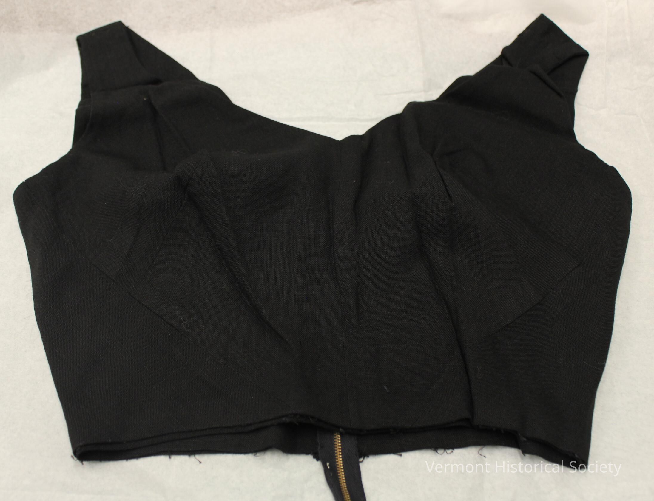 Black linen sleeveless bodice, removed from the rest of the garment. It has a V-shaped neckline at the front and back. There are darts in the front to create the bustline. A long metal zipper with black tape is inserted into the back, with the bottom of the zipper hanging loose. The bottom edge of the bodice is unfinished; it was previously attached to a very full white cotton organdy skirt.Context