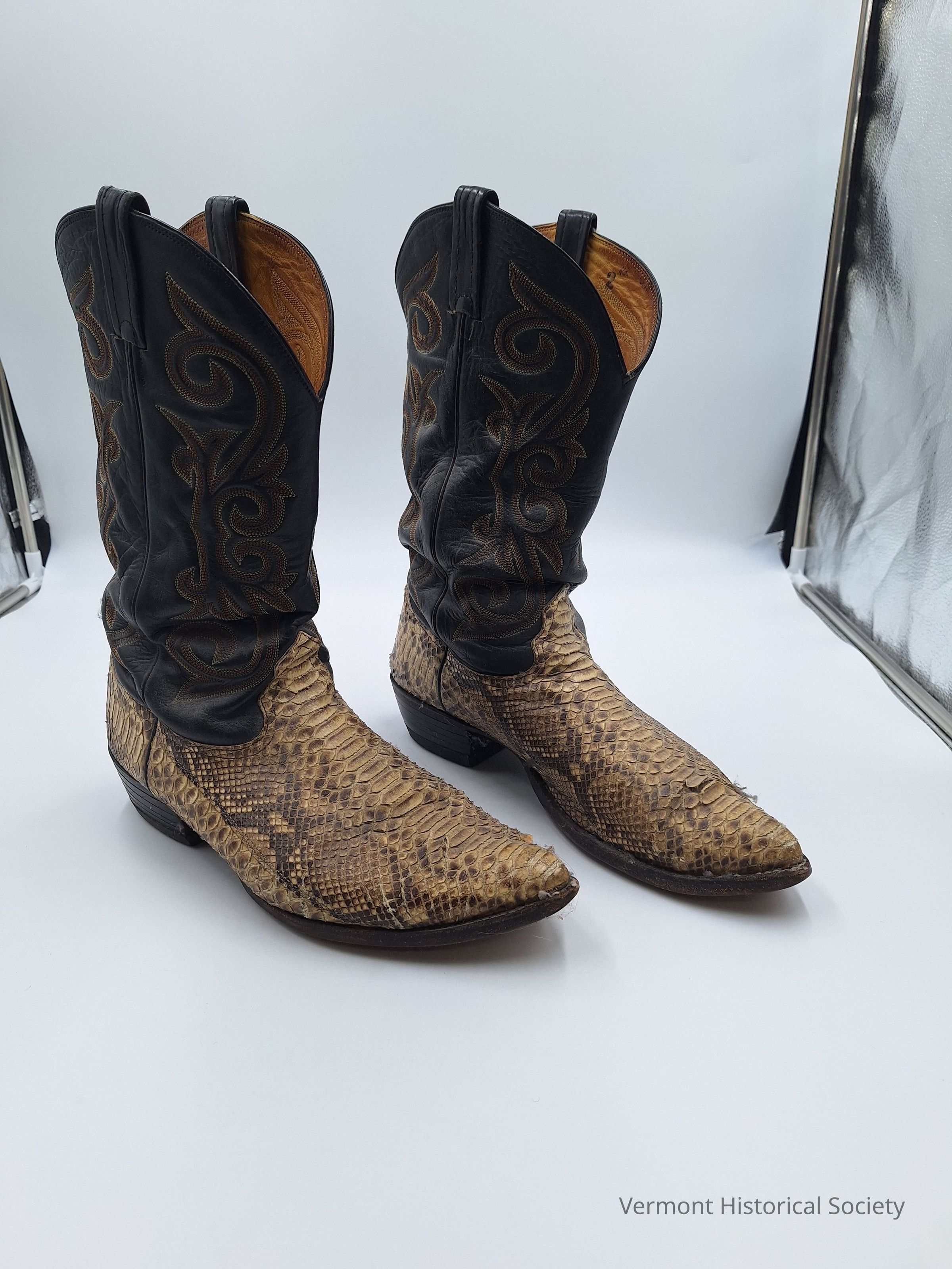 Pair of alligator skin (?) cowboy boots. The boots have dark brown leather uppers with side loops and v-indented front and back seams. There is lighter brown and tan embroidery on the uppers. The boots themselves are made of a light brown tanned skin, possibly alligator, with pointed toes and short block heels.