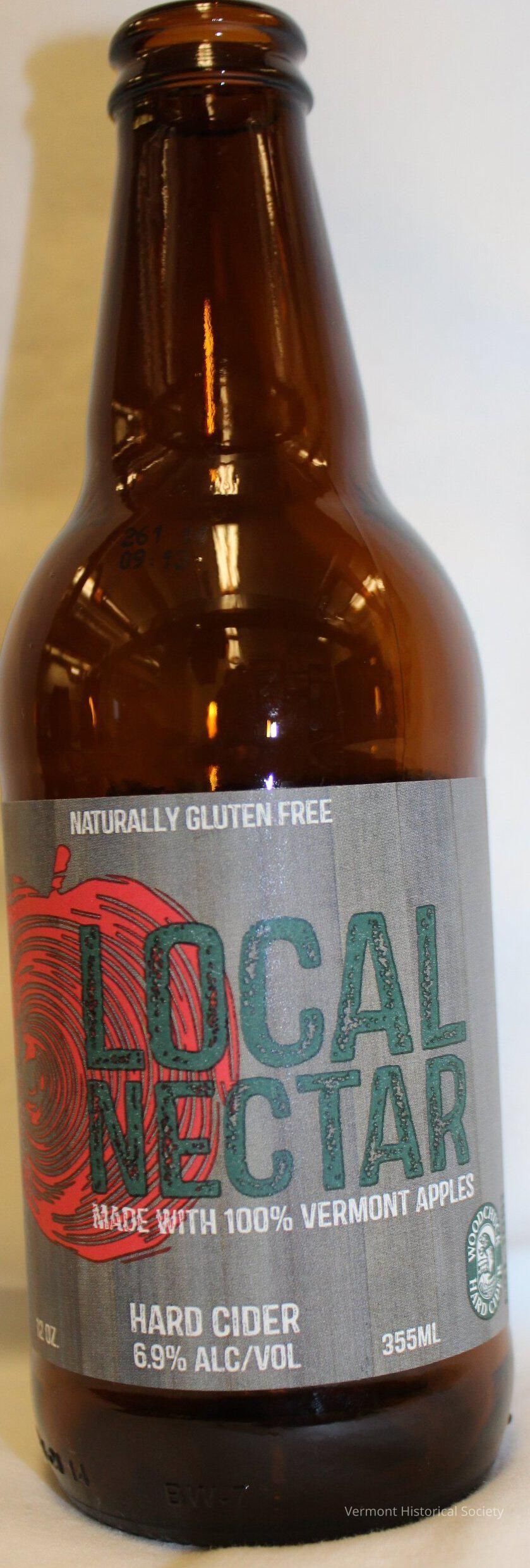 12 ounce brown glass bottle with a gray,red, and green label. The label states: "Naturally Gluten Free/LOCAL NECTAR/Made with 100% Vermont Apples/Hard Cider/6.9% ALC/VOL/12 oz.." There is a small logo on the label; Woodchuck Hard Cider/ Est. 1991." The label on the back has the government warning, the nutrition facts,and a short bio of WOODCHUCK CIDERY, Middlebury, VT.Acquisition