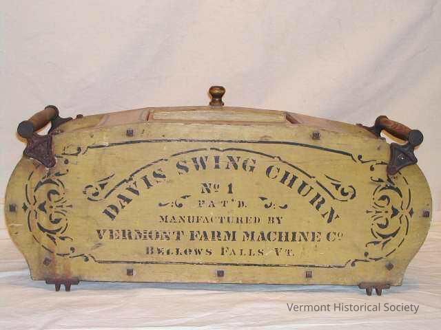 Yellow swing churn, bearing the stenciled label, "Davis Swing Churn/No. 1/Pat'd./Manufactured by/Vermont Farm Machine Co/Bellows Falls VT" in black paint on both long sides. The sides are further decorated with stenciled black decorative borders. There are two turned wooden handles across the top on either end, and metal brackets in the equivalent location on the bottom to attach the church to a wooden frame (now missing). The top of the churn has a door with a clear glass pane to view the contents.