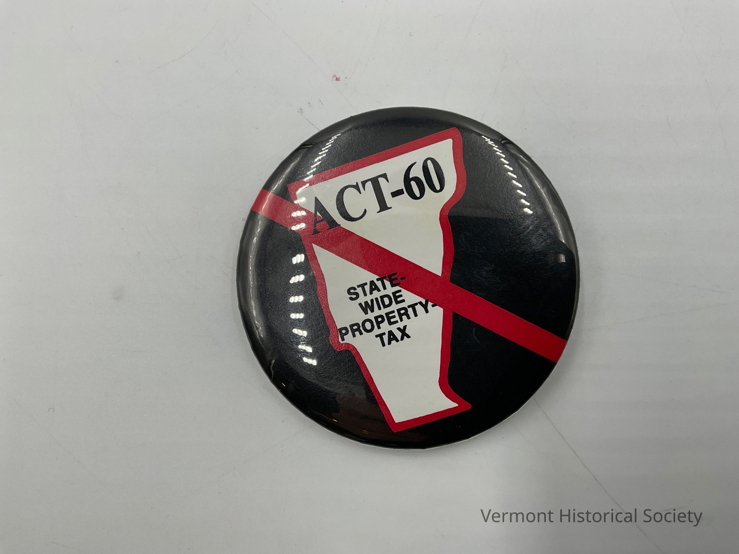 Black political pin with red outline of the state of Vermont, which is white, a red slash across the state image and the words, "Act-60, Statewide property tax.Context