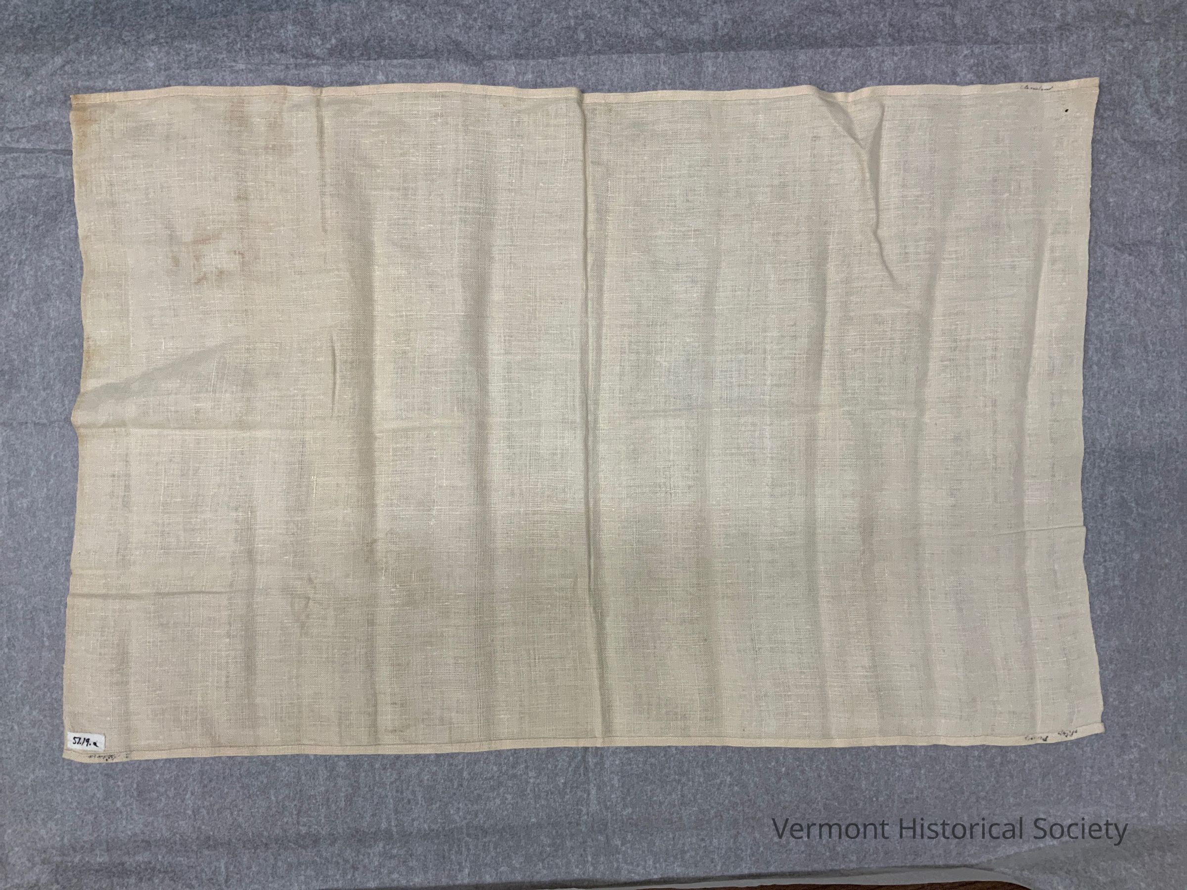 White, plain-woven linen towel. The 2 short ends are selvedges, and the 2 long ends are hemmed. The name, "Mary Powers" is inked along one edge, on the hem. There are 2 other inked, illegible marks, possibly transferred from the name. There is an eyelet stitched into one corner for hanging.Context