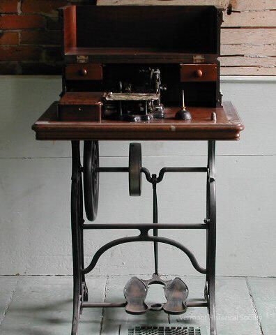 Sewing machine and stand. The small metal machine sits on a wooden table with a folding cover. Within the cover are several small drawers. Beneath the table is a cast iron stand with a foot treadle molded to fit two feet. The belts have been removed.