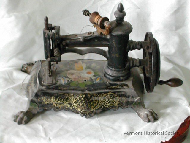 Black enameled metal sewing machine. The machine sits on a metal base with four paw-shaped feet holding up (at the corners). The base is painted on the top with flowers and on the sides with a gold filigree design. There is a wheel on the right side that controls the movement of the needle, which hangs from a horizontal arm on the left.