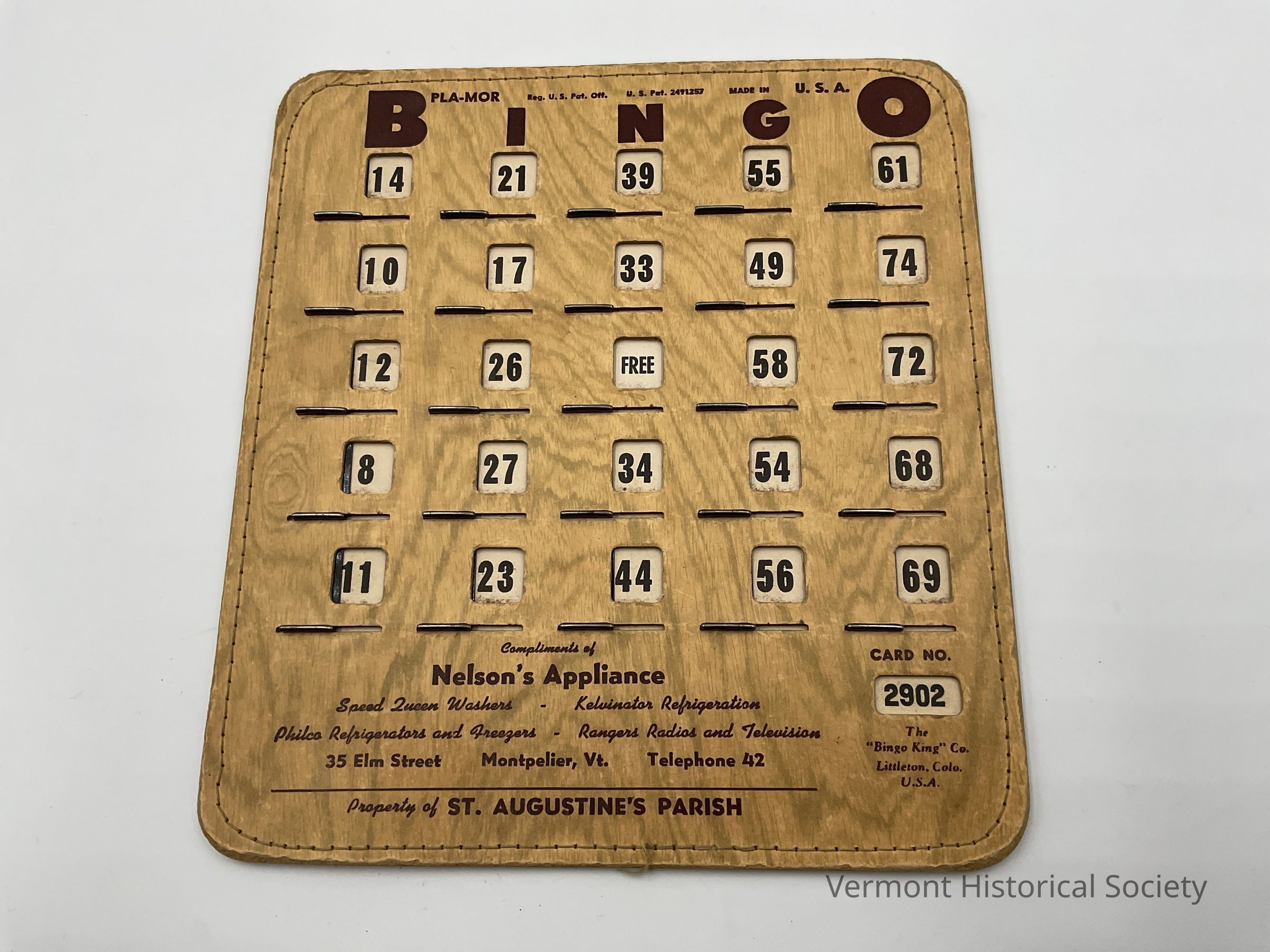 Cardboard bingo card printed with a faux bois pattern. The card has 26 windows carved into the face that show paper numbers beneath. 24 of the windows show 2-digit numbers, 1 shows the word "FREE", and 1 shows a 4-digit card number. The bottom of the card is printed with an advertisement for Nelson's Appliance in Montpelier, Vermont.