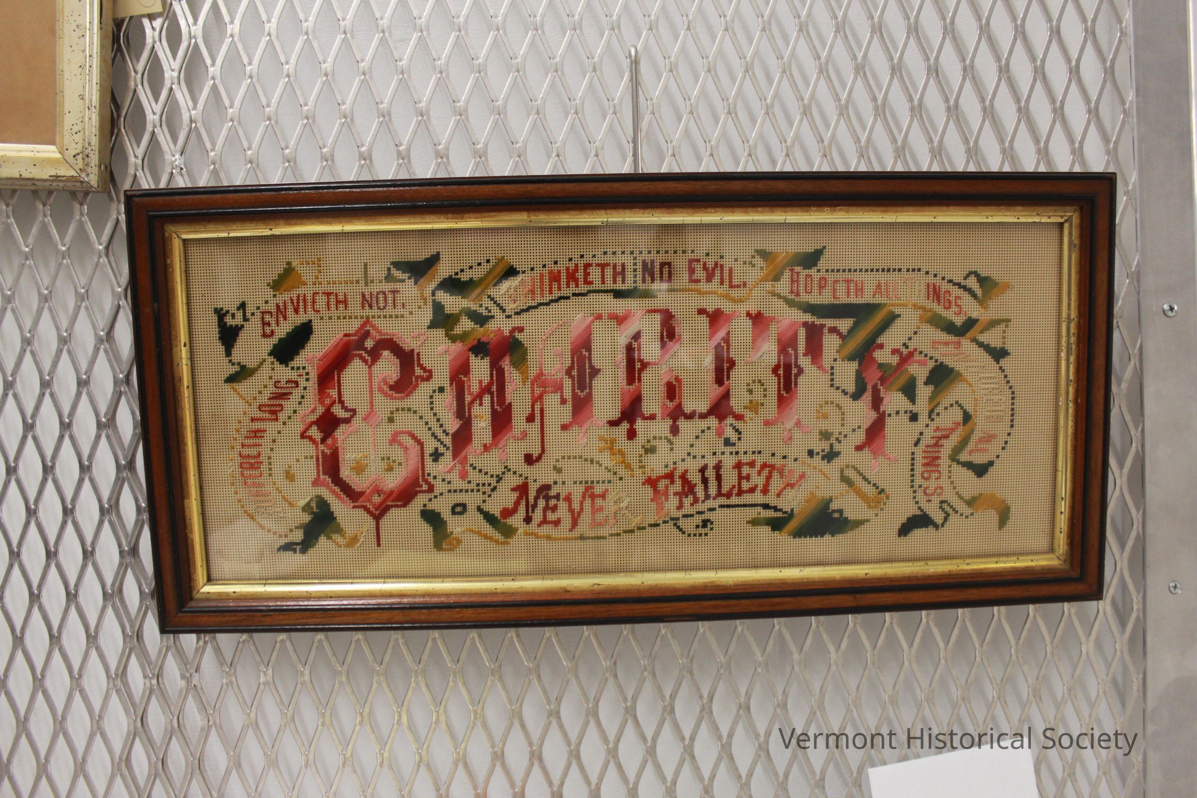 Framed embroidered picture consisting of the word "CHARITY" in gothic script surround by the phrases "ENVIETH NOT," "THINKETH NO EVIL," "HOPETH ALL THINGS," "ENDURETH ALL THINGS," "NEVER FAILETH," "SUFFERETH LONG," and "ENVIETH NOT," each separated into its own banner. The words are stitched with variegated wool yarn in shades of pink and white. They are intersperced with leaves stitched in variegated wool yarn in shades of green and yellow. The ground is pierced paper.Acquisition