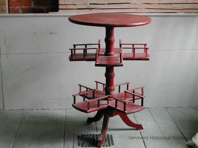 Three-tier revolving sewing stand. The top tier is a solid table top with the two lower tiers being cross shape shelves with side rails but no end rails. Painted red. Center post with three long S curve legs.