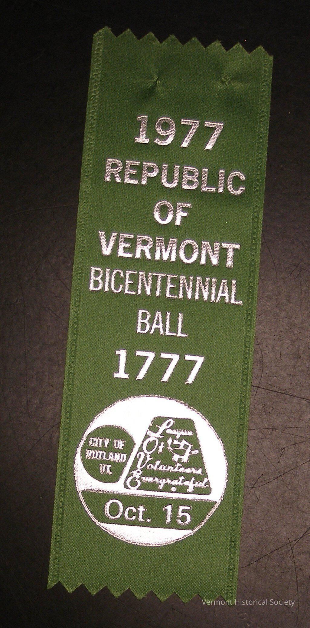 Green satin-woven silk ribbon printed in silver with the inscription, "1977 REPUBLIC OF VERMONT BICENTENNIAL BALL 1777" along with a circular logo that says "CITY OF RUTLAND VT." on the left and "League of Volunteers Evergrateful" on the right, with the date, "Oct. 15" at the bottom.Context