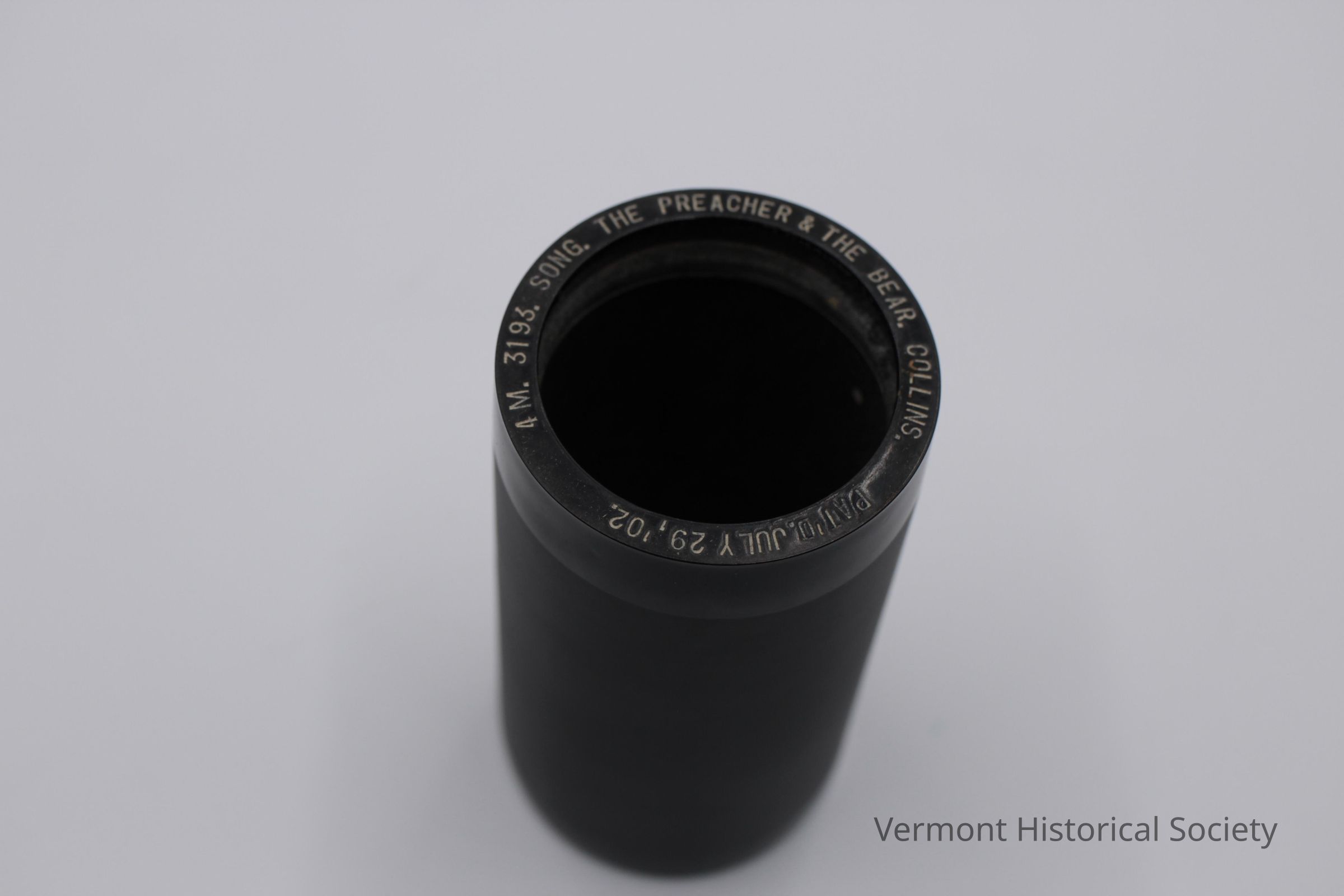 Black phonograph cylinder with a cardboard case. The cylinder, or "record", is a hollow cylinder consisting of hard, blue, ridged celluloid around a concrete core. One edge of the cylinder is labeled in white with the words, "4M. 3193. SONG. THE PREACHER & THE BEAR. COLLINS. PAT'D. JULY 29, '02."Use