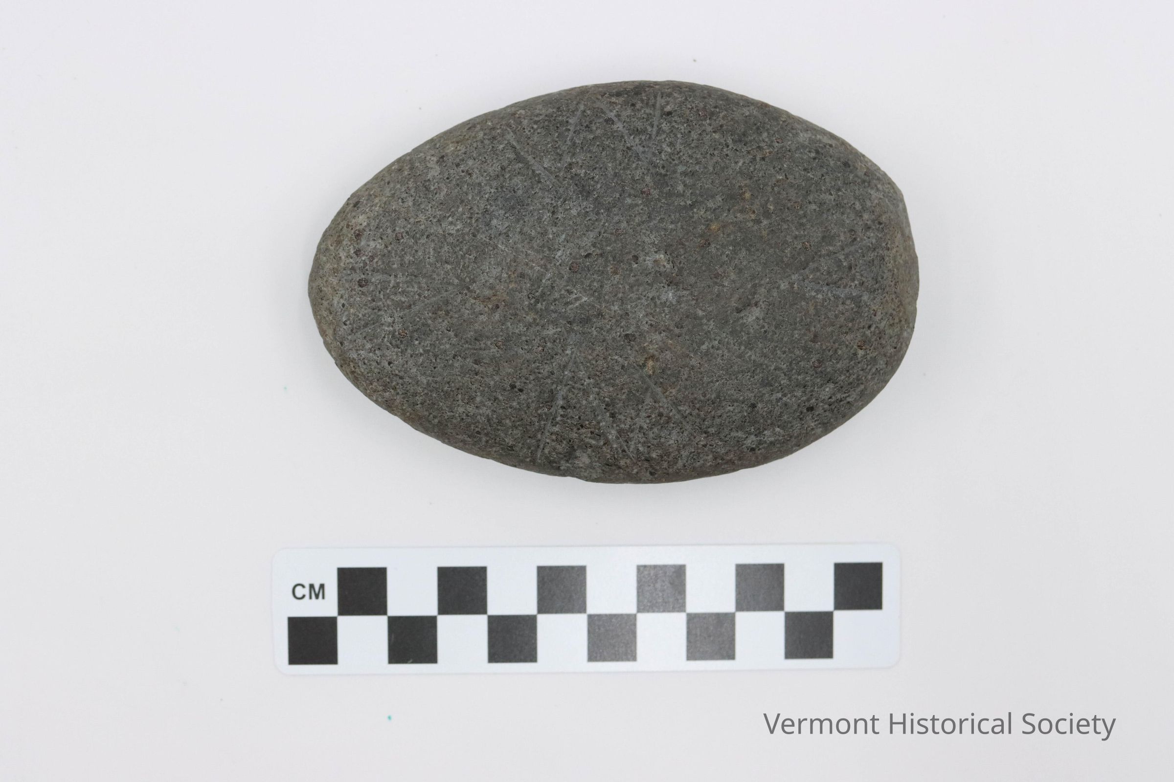 Natural oval stone incised on one face with a line drawing of two V shapes and two W shapes. The shapes are oriented pointing outward from the center, and alternate. [In the main image, the V shapes are on the sides, and the W shapes are on the top and bottom.] There is some slight pecking in the center.Context