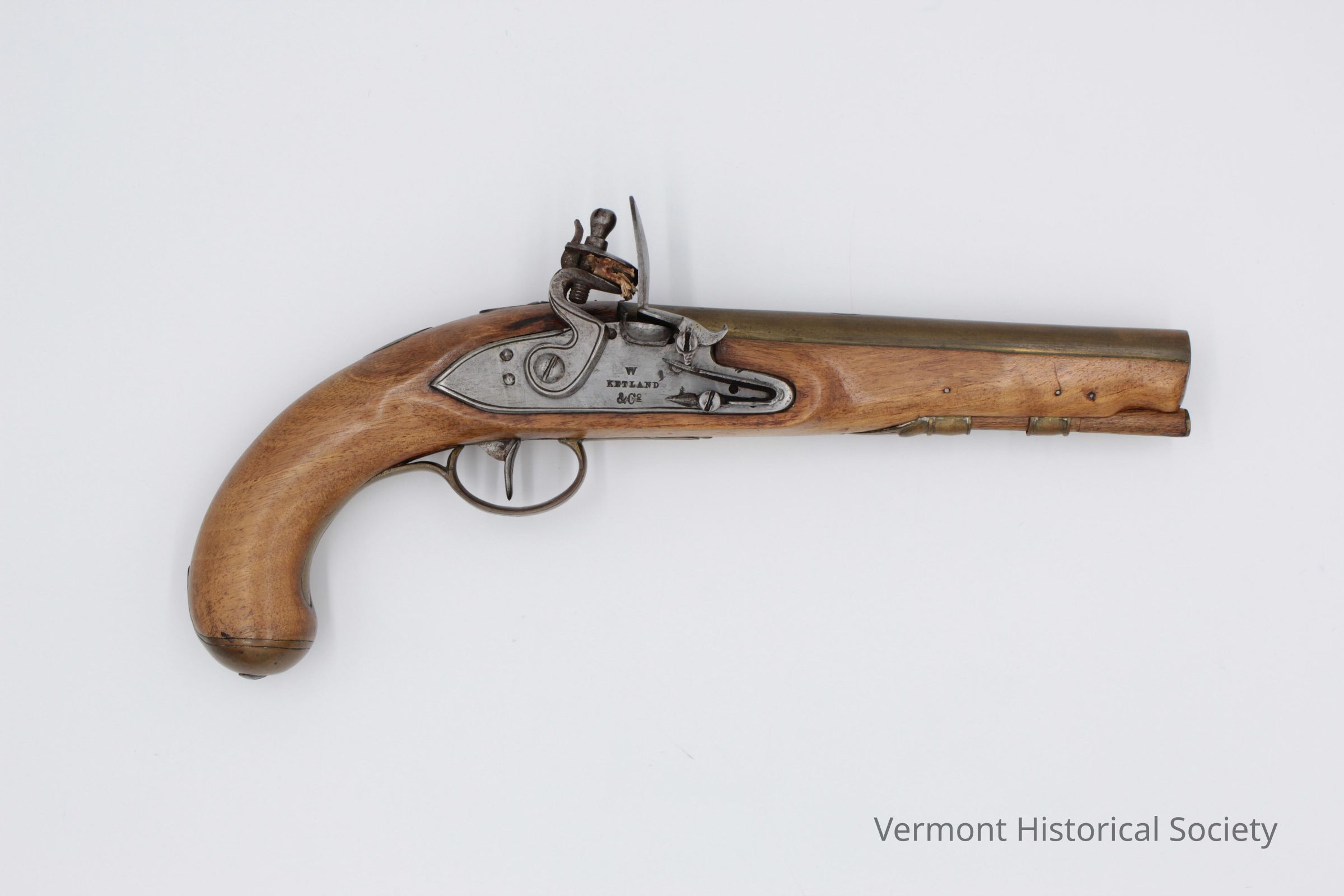 One of a matching pair of flintlock pistols with the maker's mark, "W. KETLAND & Co." on the lock plate. The body of the gun is formed from wood, with a curved handle and rounded butt capped with brass. It has a brass barrel and furniture, a steel lock, and a wooden rammer. There are various decorative engravings ont he barrel and trigger guard, including a three-petaled flower and vines. It has additional, small maker's marks, including "London", "ELG", "GR", and a crown above two crossed swords.Context