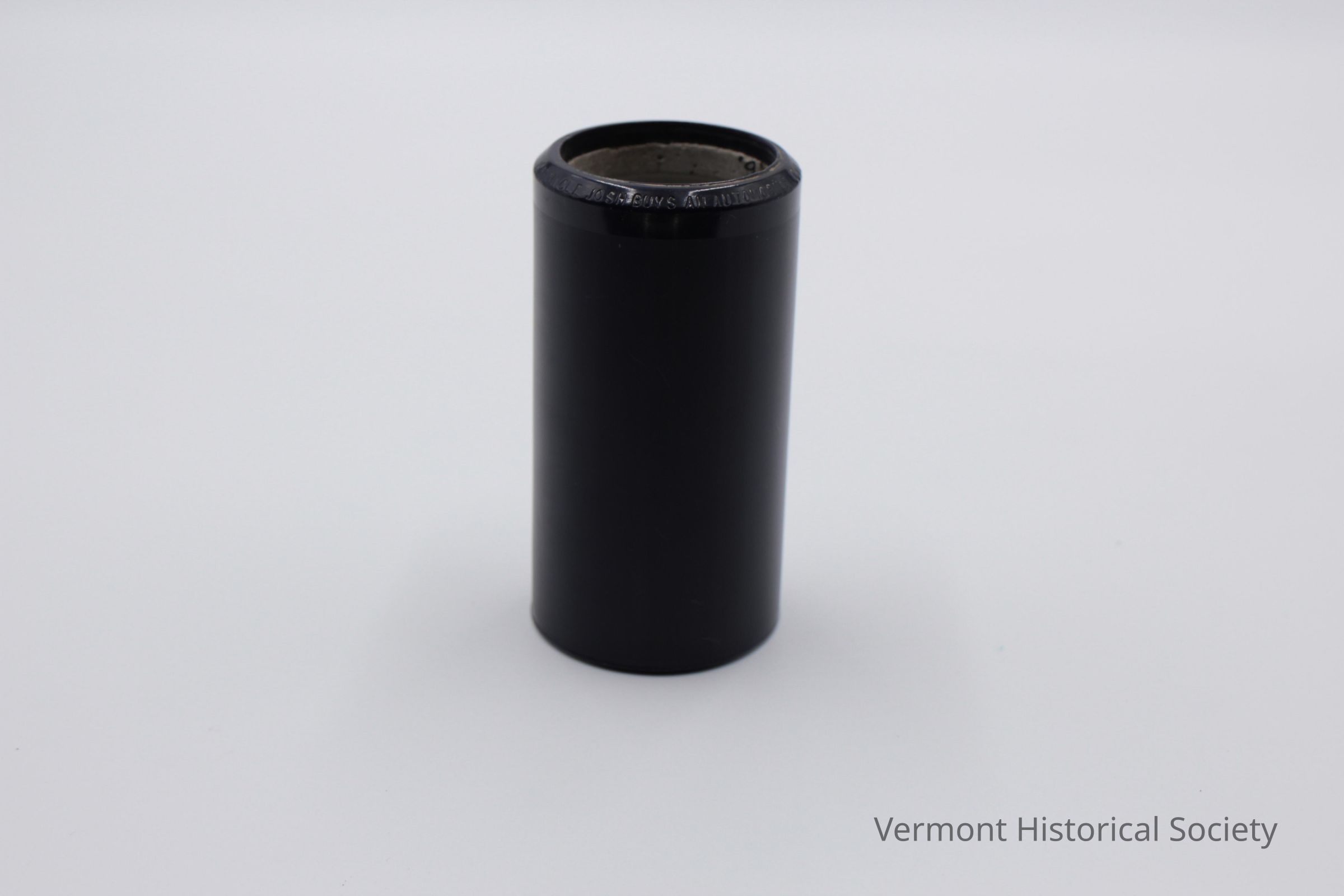 Blue phonograph cylinder with a cardboard case. The cylinder, or "record", is a hollow cylinder consisting of hard, blue, ridged celluloid around a concrete core. One edge of the cylinder is labeled in white with the words, "1583 UNCLE JOSH BUYS AND AUTOMOBILE CAL STEWART / Thomas A Edison PAT'D. 24".Use
