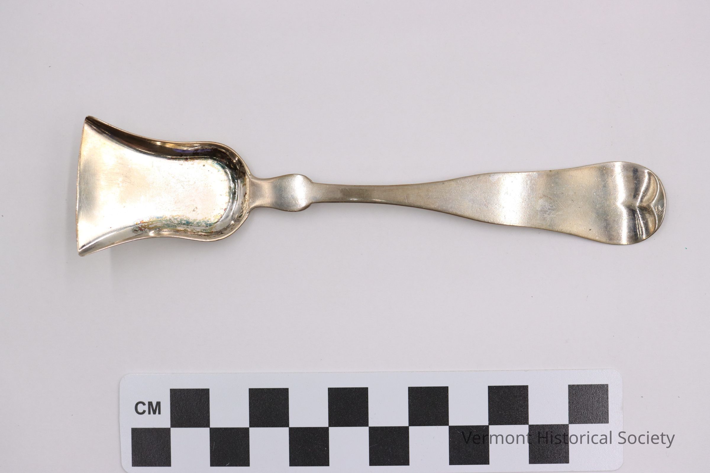 Sugar spoon with a shovel shaped bowl. The back of the handle is marked, "T.C.PHINNEY".