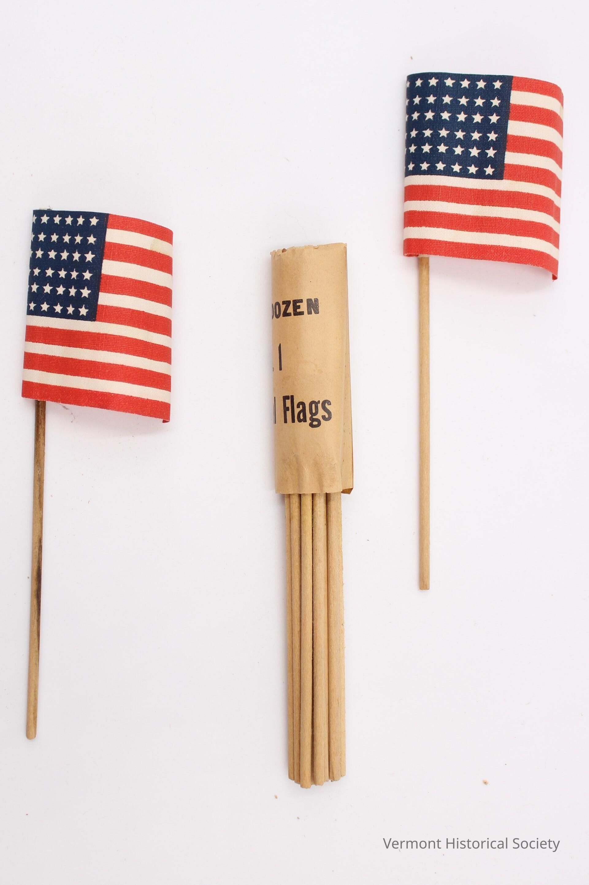 Miniature United States flags attached to small wooden dowels. 10 flags are packaged together inside of a piece of paper printed with the label, "ONE DOZEN American Flags".Context